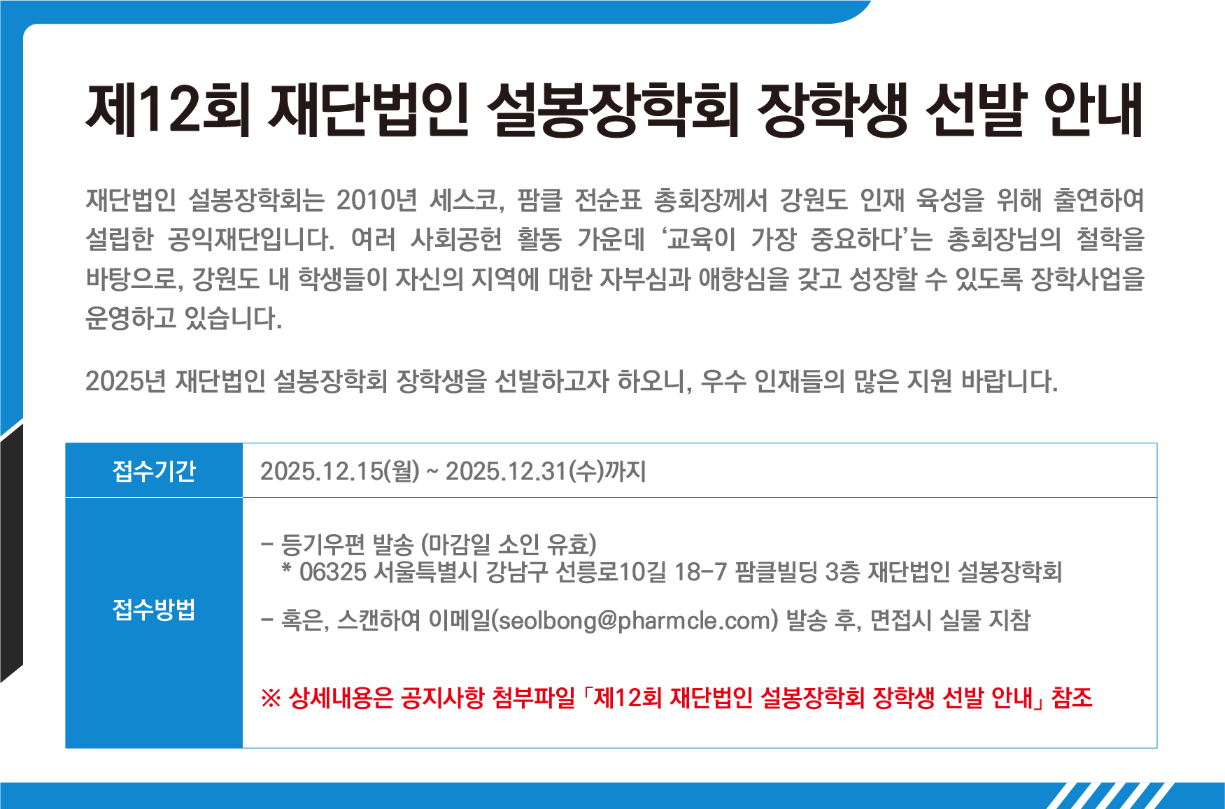 - 제12회 재단법인 설봉장학회 장학생 선발 안내 2025.12.08